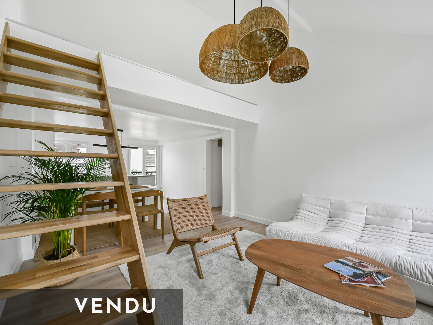 L’entrée dessert : - Le séjour cathédrale de 29m2, traversant avec ses quatre grandes fenêtres (hauteur sous plafond de 4,30m au plus haut). Il est équipé d’un canapé trois places, un fauteuil, un espace TV avec home cinéma et une table à manger extensible pouvant accueillir 6/7 personnes.
